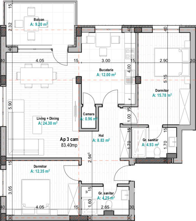 Suprafață totală: 83.40 m²