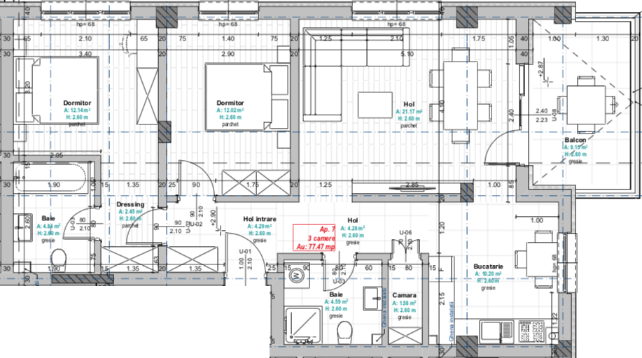 Suprafață totală: 77.47 m²