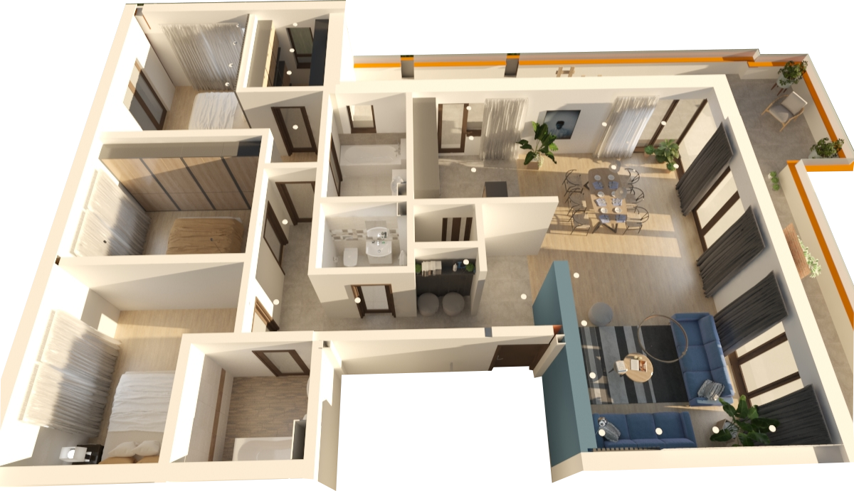 Bucură-te de priveliștea peste oraș alături de familie și prieteni în unul dintre cele mai spectaculoase apartamente din oferta noastră. Beneficiezi de 3 dormitoare, 3 băi, o terasă de peste 50 mp și un living suficient de spațios pentru toată familia.